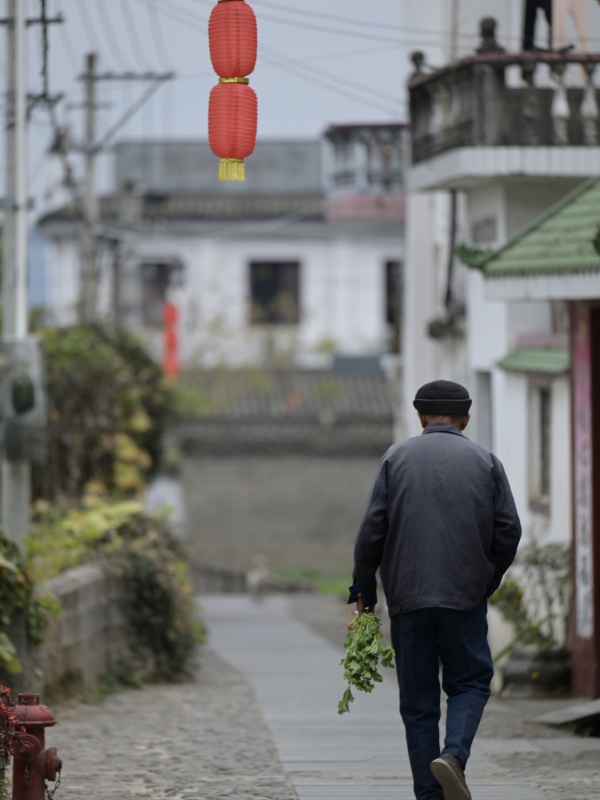 归“巢”(图片说明:红灯笼悬着年节的余温,旧巷里,他的背影驮着青蔬,把空巢的寂静,走成寻常)